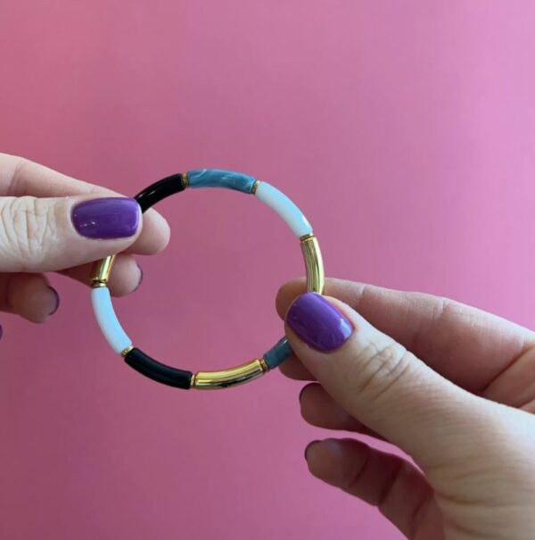 Mélange de 9 perles tubes fines assorties avec du fil élastique, et des perles hématites dorées, à insérer dans son bracelet – ou non, de quoi réaliser un joli bracelet adapté à tous les tours de poignet ! Ultra simple à réaliser.
