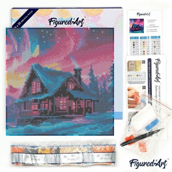 Mini Broderie Diamant 25x25cm sur châssis « Maison et Aurore boréale »