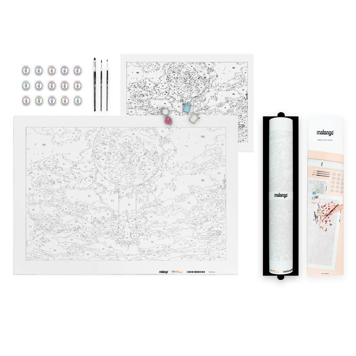 Le kit comprend 3 pinceaux de différentes tailles pour les détails de précision et les zones à peindre plus larges, Les pots de peintures numérotés correspondant aux numéros des zones à peindre et la toile roulée imprimée.